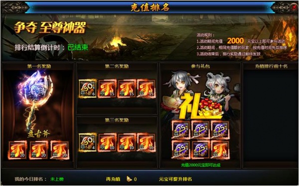 1、活动当天开启全服充值排名活动,充值满2000元宝以上,即可参与该活动。