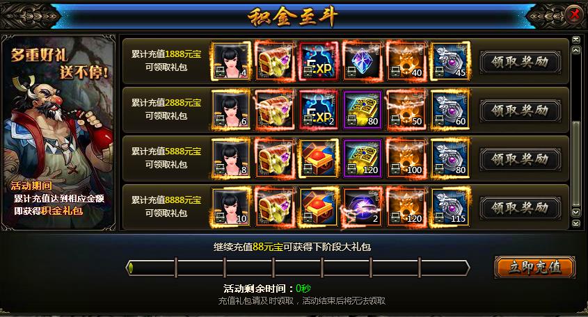 1、每充值88元宝、588元宝、888元宝、2888元宝、5888、8888元宝可获得不同档次的物品奖励;