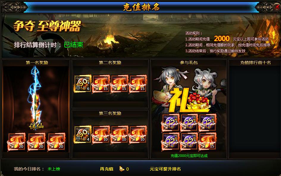 1、活动当天开启全服充值排名活动,充值满2000元宝以上,即可参与该活动。