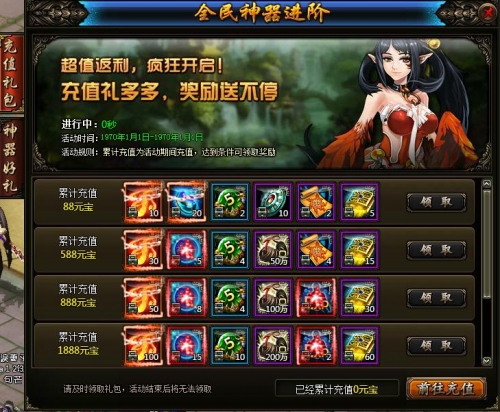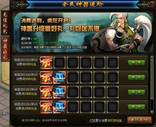 2、神器好礼:活动期间内神器进阶消费达到达到对应额度即可领取奖励