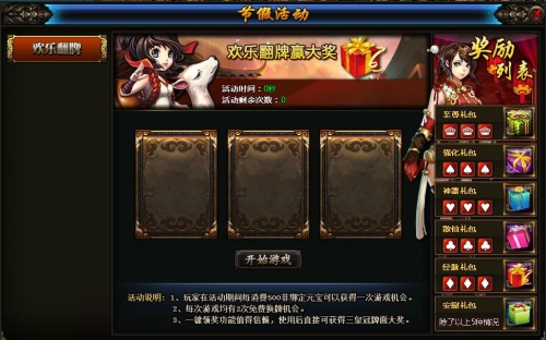 1、活动期间每消费500非绑定元宝可获得一次游戏机会;