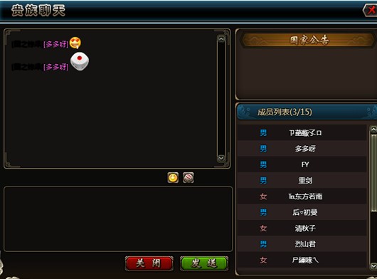 聊天系统中还有一个强大的特色,就是宗派聊天室和国家贵族聊天室。宗派、国家的贵族有两个单独的类似QQ群聊的功能,通过聊天框右下角的两个按钮开启。宗派聊天室内可以和同门中人闲聊互动;国家贵族聊天室只有国家的领导层可以使用,可以在里面探讨国家大事战略方针等。