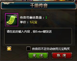 喇叭是通过消耗“千里传音”道具对全游戏世界的玩家进行喊话,每说一句话消耗一个“千里传音”道具。