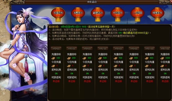 活动详情:活动期间,玩家只需充值满足当天的充值目标,即可根据比例在次日领取元宝返利。如果玩家连续达到充值目标,则返利比例逐日递增,最高可达30%!有任意一日未达到充值目标,返利比例重置到初始比例。活动结束后,如有未领取的返利,将邮件发放。