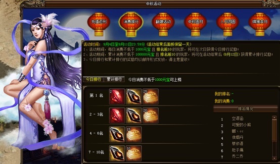 活动详情:活动期间,每日消费不低于1000元宝且排名前10的玩家,将可在次日获得今日的排行奖励。累计消费不低于10万元宝且排名前10的玩家,还将在活动结束后获得累计排行大奖。