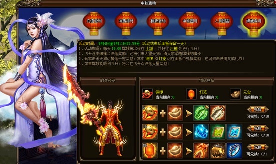 活动详情:活动期间,每天19点嫦娥将出现在土城,并赶往月神处进行飞升。飞升途中嫦娥会洒落奖励,还会引来大量天狗,玩家击杀天狗会掉落一定奖励,其中铜锣和灯笼更可在面板兑换大奖,也可双击使用变成礼券。如嫦娥能顺利飞升,将会在飞升点洒落大量奖励哦!