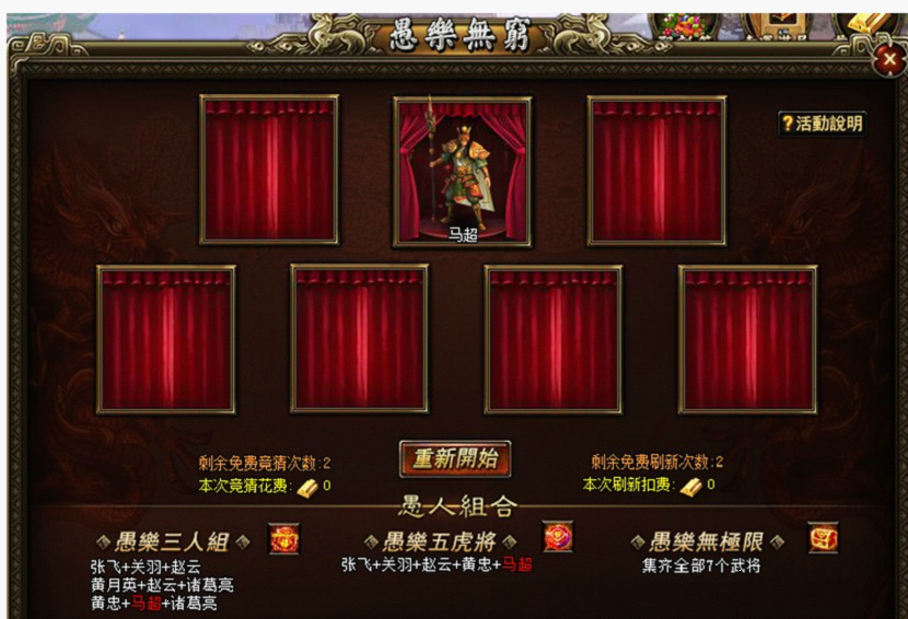 1.活动中玩家选择7个门中的任意一个门,每个门后都有一个武将,每个武将都有一份奖励,其中更有一个彩蛋武将——黄玉英,会给予一分超值奖励哦!