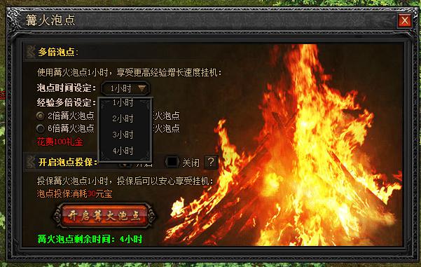 野外挂机篝火只能持续一小时实在是太不方便了,所以我们加入了时间选取功能,现在玩家在使用挂机篝火时能够选择持续的时间了。(每天的总篝火泡点时间不变)