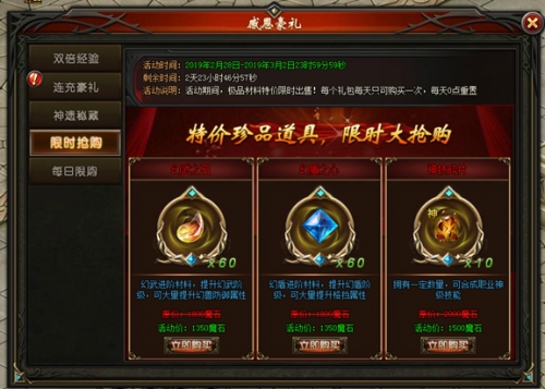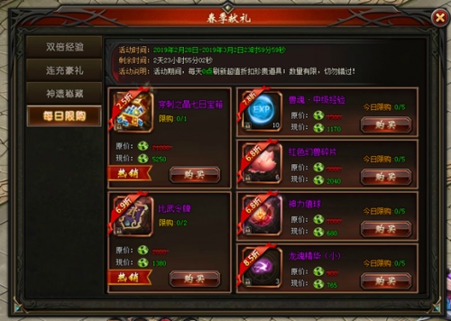 活动说明:活动期间,每天0点刷新超值折扣珍贵道具! 数量有限,切勿错过