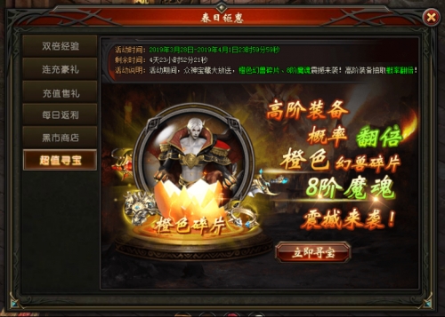 活动说明:活动期间,众神宝藏大放送,橙色幻兽碎片、8阶魔魂震撼来袭!高阶装备抽取概率翻倍!