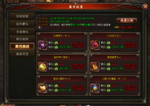 活动说明:活动期间,每日使用黑市入场券或888魔石可入场购买超值道具