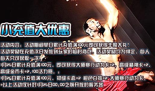 1月25日累计充值满100元,即可获得大师赛行动力卡*2,高级精神卡*2,高级金币卡*2,100活力瓶。;
