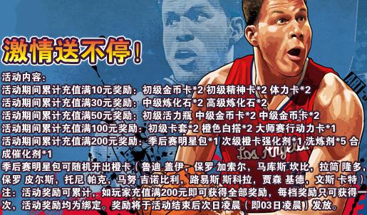 活动期间累计充值满200元奖励:季后赛明星包*1 次级橙卡强化剂*1 洗炼剂*5 合成催化剂*1