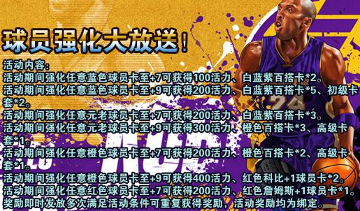 活动期间强化任意橙色球员卡至+9可获得400活力、红色科比+1球员卡*2。