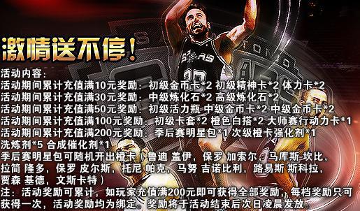 活动期间累计充值满200元奖励:季后赛明星包*1?次级橙卡强化剂*1?洗炼剂*5?合成催化剂*1