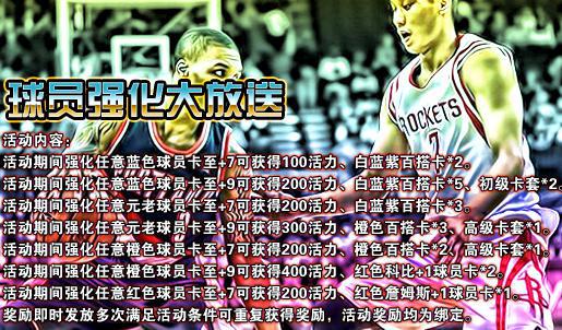 活动期间强化任意橙色球员卡至+9可获得400活力、红色科比+1球员卡*2。