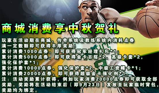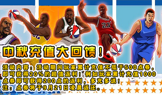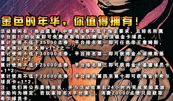 活动内容:活动期间在《热血篮球》中使用点券不低于指定要求,且排名所属平台前10的玩家即可免费获取有官方赠送的顶级金卡球员。
