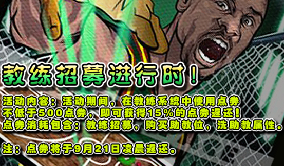 活动内容:活动期间,在教练系统中使用点券不低于500点券,即可获得15%的点券返还!