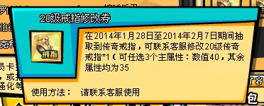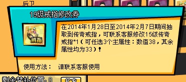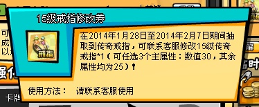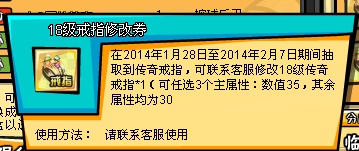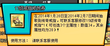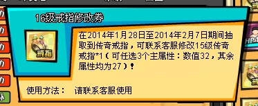 新增土豪的年货,售价6888点券,有几率开出有几率开出15级戒指修改券,16级戒指修改券,17级戒指修改券,18级戒指修改券,19级戒指修改券,20级戒指修改券。