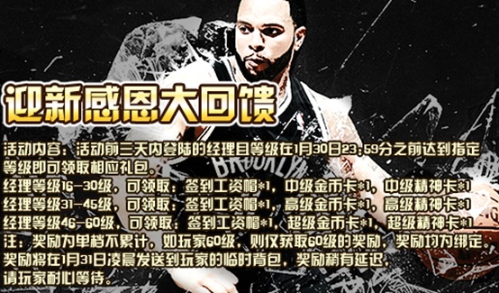 活动内容:活动前三天内登陆的经理且等级在1月30日23:59分之前达到指定等级即可领取相应礼包。