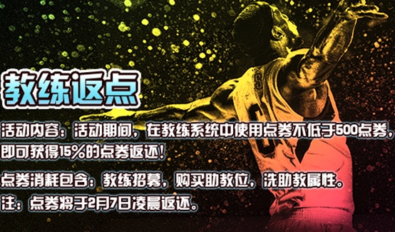 活动内容:活动期间,在教练系统中使用点券不低于500点券,即可获得15%的点券返还!