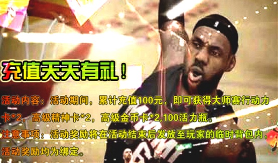 活动内容:活动期间,累计充值100元,即可获得大师赛行动力卡*2,高级精神卡*2,高级金币卡*2,100活力瓶。