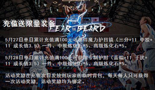 5月27日单日累计充值满100元可获得魔力护目镜(三分+11 中投+11 成长值3.5)一件、中级炼化石*5、高级炼化石*5。