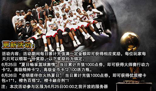 6月25日“夏日畅享篮球激情”当日累计充值1000点券,即可获得大师赛行动力卡*2,高级精神卡*2,高级金币卡*2,100活力瓶。