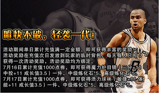 活动内容:活动期间单日累计充值满一定金额,即可获得丰富的奖励!活动奖励在充值次日发放到玩家的临时背包,每天每人只可获得一次活动奖励,活动奖励均为绑定。7月16日累计充值1000点券,即可获得魔力护目镜(三分+11 中投+11 成长值3.5)一件、中级炼化石*5、高级炼化石*5。?7月17日累计充值1000点券,即可获得活力球袜(敏捷+11,体能+11,成长值3.5)一件、中级炼化石*5、高级炼化石*5。