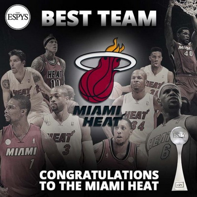 在今天进行的2013年ESPY颁奖典礼中,2012-13赛季的迈阿密热火队获得了“最佳体育团队”这一殊荣,他们也蝉联了这一尊贵的荣誉。至此,热火在本届ESPY颁奖中大获全胜,他们拿下了最佳比赛、最佳体育团队两项大奖。此外,詹姆斯还蝉联了年度最佳运动员、最佳NBA球员和最佳冠军表现三项大奖。