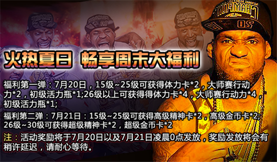 福利第一弹:7月20日,15级~25级可获得体力卡*2,大师赛行动力*2,初级活力瓶*1;