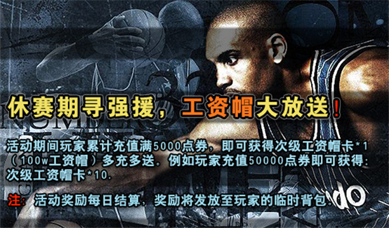 活动内容:活动期间玩家累计充值满5000点券,即可获得次级工资帽卡*1(100w工资帽)多充多送。例如玩家充值50000点券即可获得:次级工资帽卡*10.