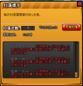 达到VIP2的玩家可以在大师赛中点击球队图标,进入奖励界面进行扫荡。扫荡分为点券扫荡和行动力扫荡,每次扫荡需消耗1点点券,系统会自动计算出玩家的点券及行动力能够扫荡的次数。