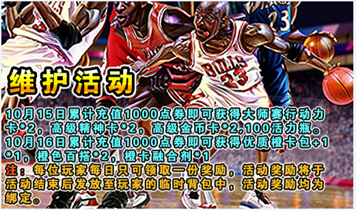 10月15日累计充值1000点券即可获得大师赛行动力卡*2,高级精神卡*2,高级金币卡*2,100活力瓶。