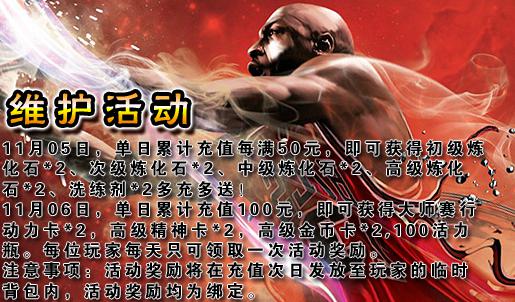 11月5日,单日累计充值每满50元,即可获得初级炼化石*2、次级炼化石*2、中级炼化石*2、高级炼化石*2、洗练剂*2多充多送!