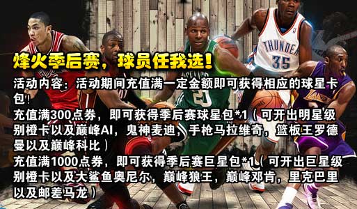 充值满300点券,即可获得季后赛球星包*1(可开出明星级别橙卡以及巅峰AI,鬼神麦迪,手枪马拉维奇(新加技能),篮板王罗德曼以及巅峰科比)