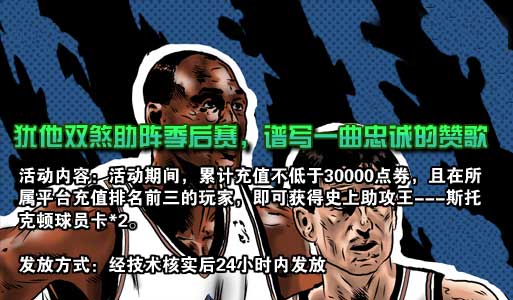 活动内容:活动期间,累计充值不低于30000点券,且在所属平台充值排名前三的玩家,即可获得史上助攻王---斯托克顿球员卡+1*2。