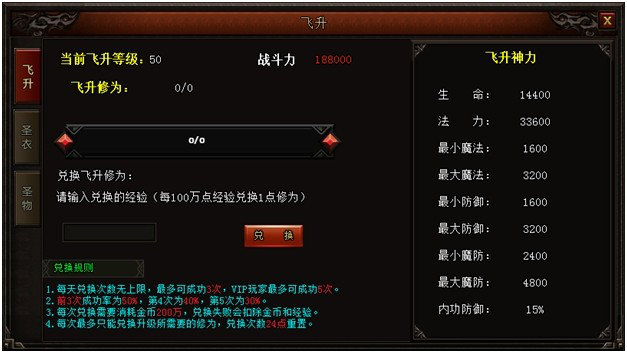 1)飞升等级开放至50级,5阶圣衣随之开启。