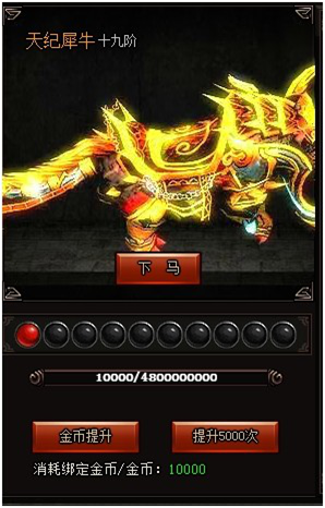 一、全新坐骑“天纪犀牛”开放,坐骑将进入十九阶时代。
