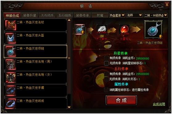 1)玩家可以通过使用传奇装备加上特殊道具,从而进行神装合成,获得与传奇装备同等级的热血套装。