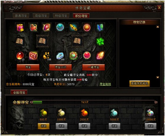 三、传奇宝藏调整,取消传奇抽奖和传奇兑换,并全新加入积分抽奖功能,可以用500传奇积分抽奖。