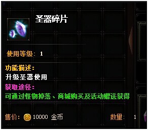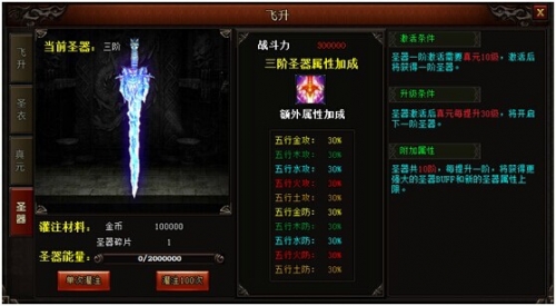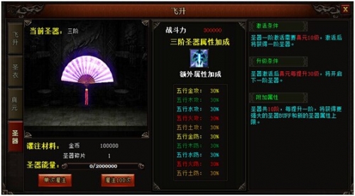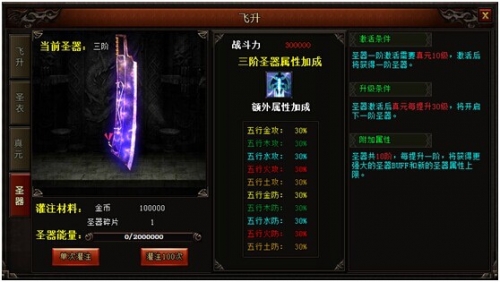 二、圣器目前开放至三级,真元每提升30级圣器便可提升一级,70级可达到三级。升级需要消耗圣器碎片。