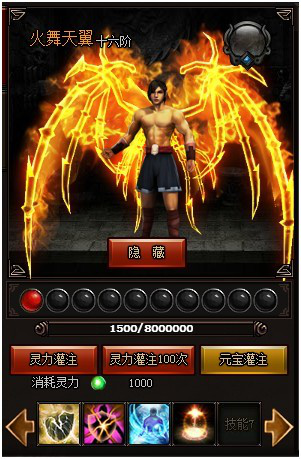 一、全新十六阶神甲“火舞天翼”开启,让你属性飞一般的提高。同时神甲技能开放新技能栏,玩家可以装备更强力神甲技能。