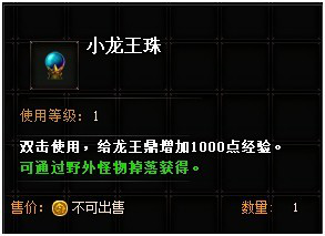 1)小龙王珠:双击使用,给龙王鼎增加1000点经验。可通过野外怪物掉落获得。