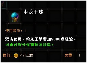 2)中龙王珠:双击使用,给龙王鼎增加5000点经验。可通过野外怪物掉落获得。