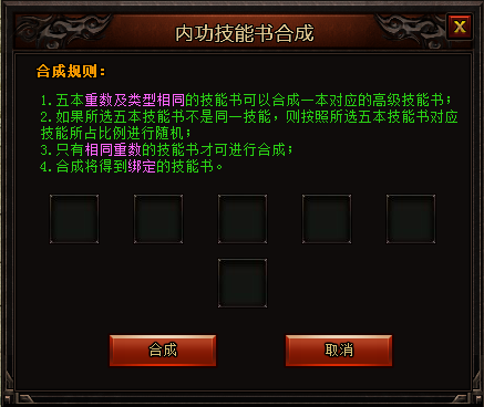2)如果相同重数但不是同一种技能的5本技能书合成,则合出来的技能书是按照放入的五本内功技能书所占比例,随机产出。