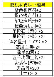 橙色资质丹*5、红色资质丹*3、资质保护符*4、铜钱100000、天命丹*500 |