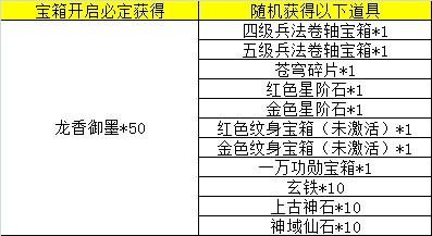 红色锁定符*5、金色纹身宝箱(已激活)*1、龙香御墨*150、五千功勋宝箱*15、超值神器秘丹(限时)*1、天命丹*1000 |