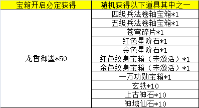 五级兵法卷轴宝箱*1、红色纹身宝箱(已激活)*1、龙香御墨*100、禄星如意*20 |