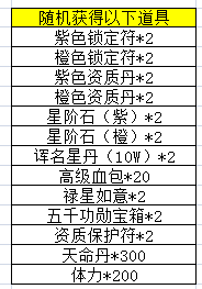 体力*1800、八倍经验丹*1、丹魂礼包*80、灵丹*5000、纯真卡片*5、红色双属性纹身“枪裂吟长空”(未激活)*1、金色双属性纹身“破世”(未激活)*1 |